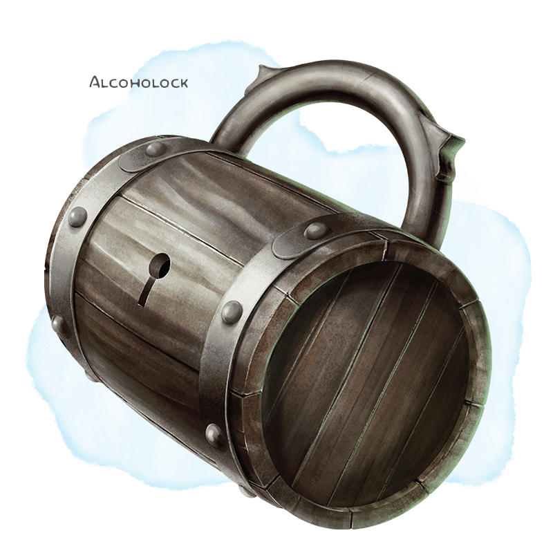 You can bind an alcoholock to an alcohol by submerging it in the drink for 1 hour. The drink can be made of one or several kinds of alcohol, potentially complicating the lock. Once bound, the lock can't be bound to a different kind of drink. You can identify what drink the lock is bound to with a successful DC 15 Wisdom (Perception) check, using your sense of smell to detect what's been poured into the lock. The DC increases by 2 for each additional kind of alcohol used to bind the lock after the first, up to a maximum DC of 25. An identify spell also determines what drink the lock is bound to. Alternatively, the lock can be broken with a successful DC 25 Strength check.