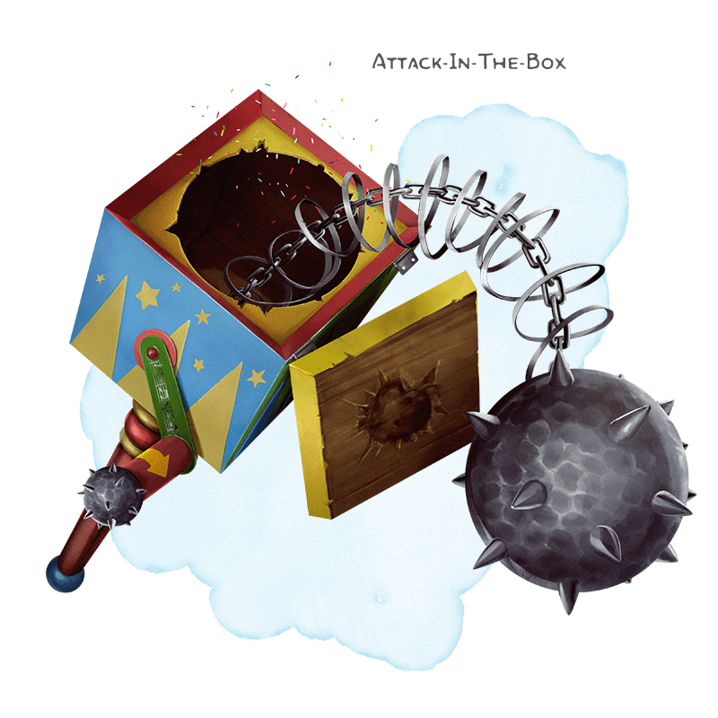 A colorful box sits at the top of this weapon's wooden handle. Within the box is a coiled spring beneath the flail's spiked head. The head springs out from the box the first time you make an attack with it, granting you advantage on the attack roll and creating a random effect. Roll a d6 and refer to the table below to determine the effect. You can use an action to stuff the head back into the box, or use a bonus action to cause the head to harmlessly spring from it.