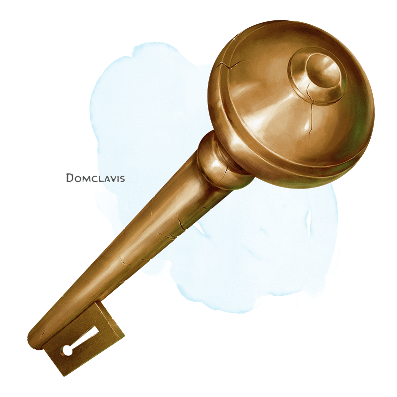 This brass key's head is in the shape of a small doorknob and has a keyhole cut into its bit. You can use an action to insert the key into a closed door's keyhole and speak the key's command word while turning it. When you do, the door magically opens to reveal an extradimensional room that's 20 feet on a side with 10-foot-high ceilings. The room is comfortable and dry with various fur rugs and six well-worn armchairs. A fire always burns in its hearth. Furnishings and other objects created by this effect dissipate into smoke if removed from the room. A creature inside the room can open the door to allow other creatures inside. Opening the door from the outside as normal, without the key in its lock, doesn't reveal the extradimensional space.