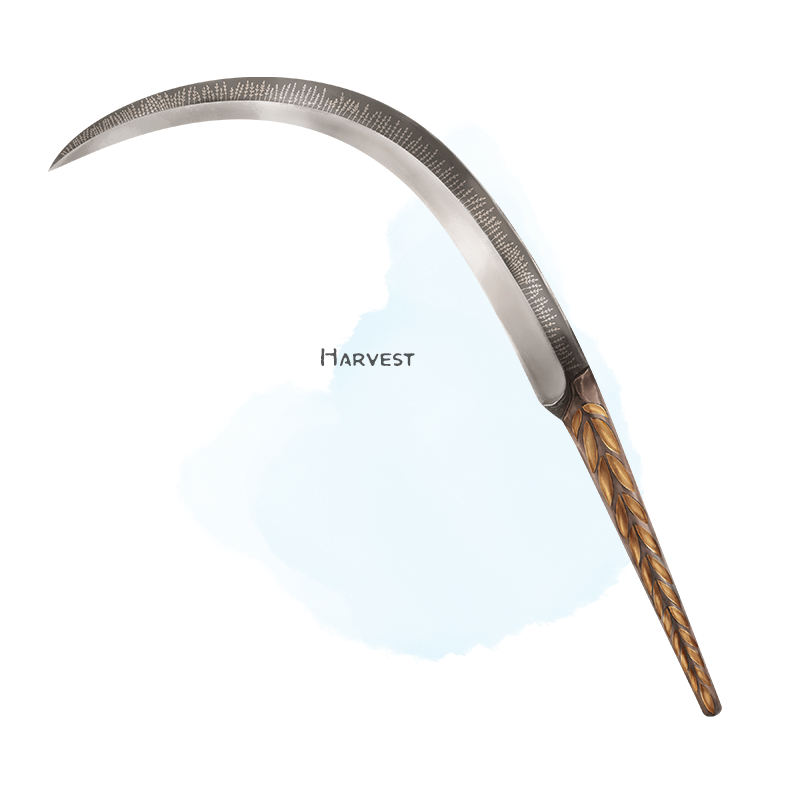 This classic farmer's heirloom depicts wheat and field designs. When you hit a plant creature with an attack using this magic weapon, the target takes an extra 1d6 slashing damage. In addition, any nonmagical plant harvested with this sickle magically remains fresh for an extra 7 days.