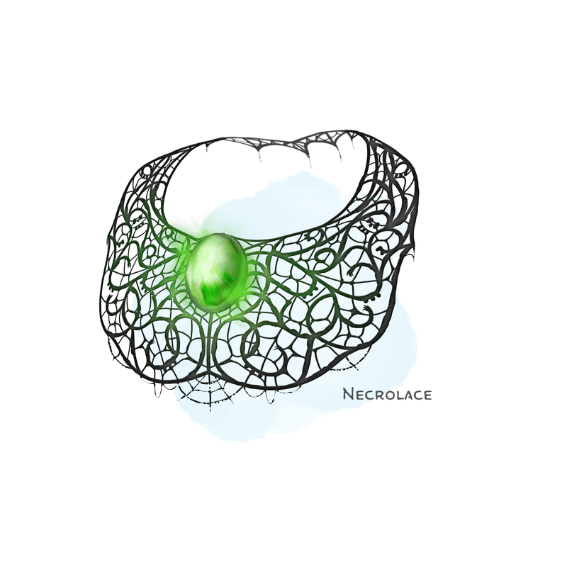 This necklace allows you to absorb the life energy of creatures you slay. When you reduce a Small or larger creature who is hostile toward you to 0 hit points, the necklace emits a faint glow and gains 1 charge. The necklace can hold up to 3 charges and contains 1d3 charges when found. You can expend 1 or more charges as a bonus action to turn death into life. You take 1d8 necrotic damage for each expended charge and heal another creature you can see within 30 feet of you for twice the amount of necrotic damage you took. This damage ignores resistance and immunity.