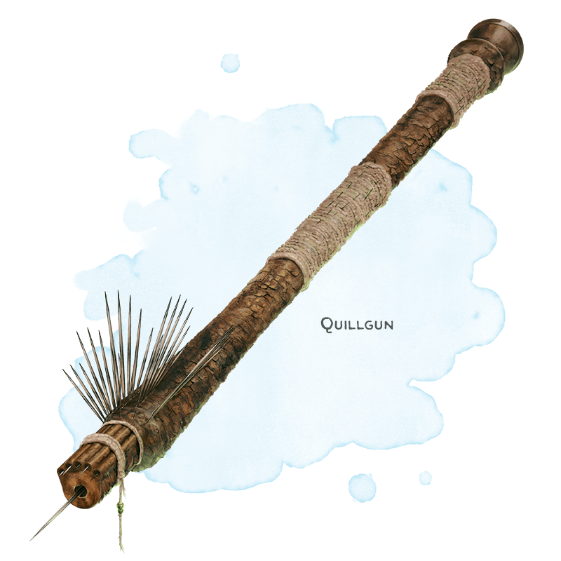 This magic blowgun is made from a rough spruce branch. At its end is a collection of sharp porcupine quills. The blowgun has 30 quills and regains all expended quills daily at dawn; it then loads itself with 6 of those quills, unless it was already loaded with other ammunition.
