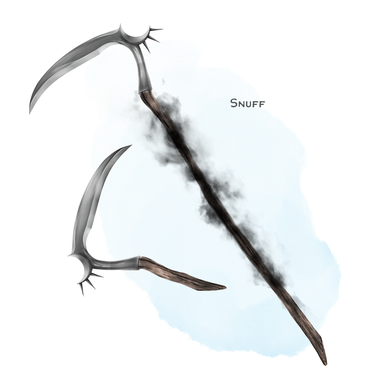 As an action, you can draw your hand over the sickle’s handle to magically extend it downward: turning the sickle into the form of a scythe wreathed in shadow. While in this form, the sickle has the two-handed and reach properties. While holding the weapon, you can return the sickle to its one-handed form using a bonus action.