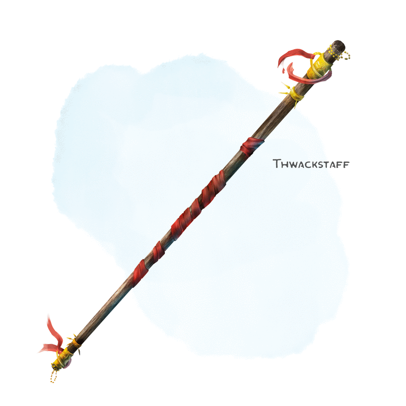 This festive quarterstaff is decorated with ribbons and other glittering elements. It is perfectly balanced and seems to be made to perform with. This magic quarterstaff has the finesse property and grants you a +1 bonus to Charisma (Performance) checks you make in order to put on an entertaining performance using the quarterstaff.