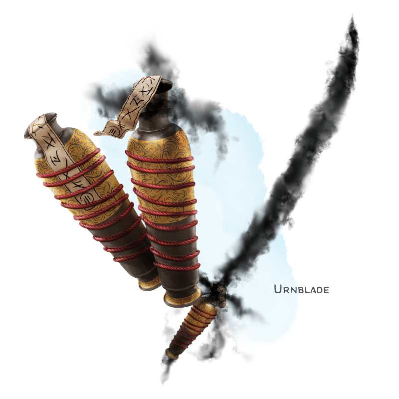 This item appears to be a small cremation urn. While grasping the urn, you can use a bonus action to speak its first command word and cause its lid to unseal. When you do, a curved blade of dark smoke pours from the mouth of the urn. Speaking the command word again reseals the urn and causes the blade to disappear. If you are proficient with shortswords or longswords, you are proficient with the urnblade.
